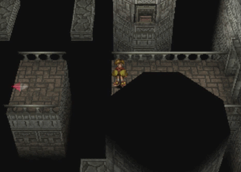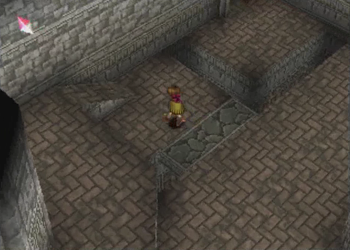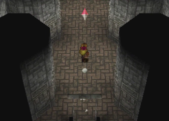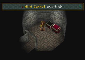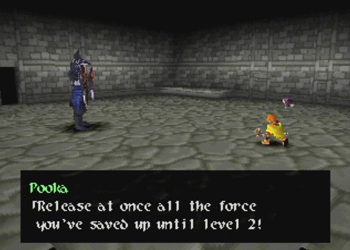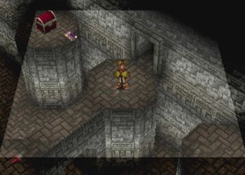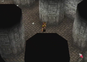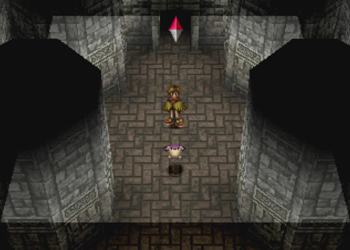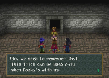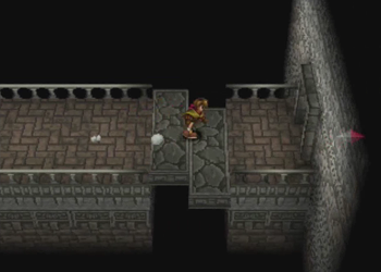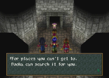 Here’s Pooka in action. Hanpan of Wild Arms 1 was a tool that basically worked like Ashley’s daggers (one straight shot), but Pooka has full reign of the entire screen. This will, of course, lead to a number of situations where Pooka can float around and be carefully navigated into precise locations. We’ll see a lot of that in this dungeon.