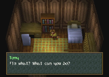 Not pictured, but Tim has one amazing healing spell that he likely picked up during his solo run of the previous dungeon. First Aid is learned from his Pretty Pony medium (the one he equips by default), and it’s a party wide heal that always goes first. The “party wide” thing isn’t that important when Tim is by his lonesome, but guaranteed healing before you take a hit is a godsend in… basically every battle ever. The only downside of this ability is that Tim is usually the first to die in a battle, so make sure he’s alive enough to use his First Aid.