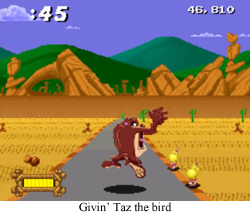 - System: Sega Genesis for the platformer, SNES for the runnin’ of the Taz. The Genesis game was compromised and ported to Master System and Game Gear, too. Also, there was a Gameboy version that had nothing to do with anything.