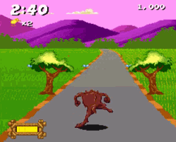 You will never be able to convince me that Taz-Mania (SNES) did not start as a Wily E. Coyote game that was randomly modified to be a Taz-Mania tie-in. This title plays vaguely like SNES Mario Kart, and takes full advantage of Mode 7 capabilities to place Taz on an endless stretch of highway where he must catch kiwis (the highly mobile birds, not the much easier to catch fruit). Every level contains an escalating number of kiwis, and there are few hazards (like buses and… mostly just buses) to keep Taz down. After catching the requisite kiwis, Taz falls asleep, the kiwis escape his gaping maw (that’s how digestion works, right?), and the whole thing starts again. Repeat for five acts (worlds) with three stages each. Throw in a few bonus stages where you can catch infinity kiwis for a score that impacts nothing, and you’re got the entire game.