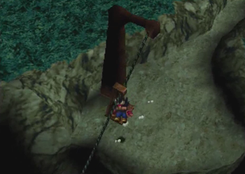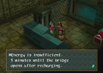 Anyway, here we are at the other end of the bridge. There’s a crystal for saving, and the control panel Liz was using (and some treasure) is behind a lousy chain link fence that is somehow immune to all of our tools. Guess we’ll be back later with bolt cutters.