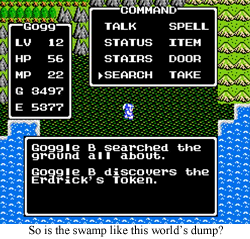So, after discovering that Dragon Warrior is not just “primitive fun” like Final Fantasy, but more “never been fun” like Wizards and Warriors, I was forced to ask the obvious question: why? Not “why does this game suck” (that is already obvious), but why did DW spawn the JRPG genre? Was it some kind of cultural misunderstanding? Was it the monster designs? Was it an unmistakable love of carrying princesses through swamps? No, I want to say the entire reason Dragon Warrior spawned decades worth of sequels, spin-offs, and that one surprisingly sticky controller is this…
