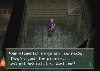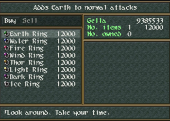 Elemental Rings are expensive, but they will add elemental attributes to your attacks and defense. This isn’t all that useful for random mobs, but some bosses are very elemental-based, so a set of three for the party could cut down a game over-ing multi-hit attack to a mere tickle. This is useful particularly for some of the optional super bosses, and all but required for the super-duper death of all things optional boss of the franchise.