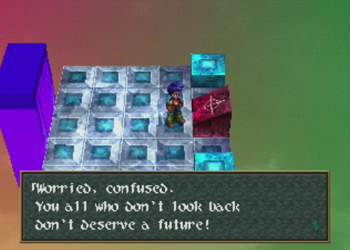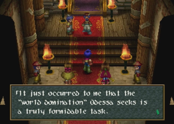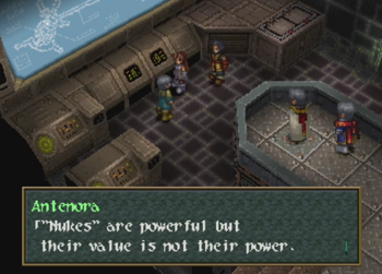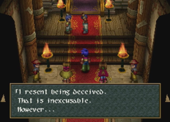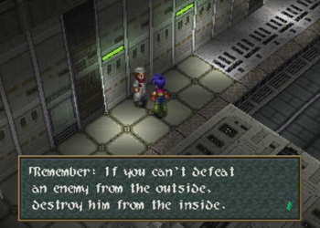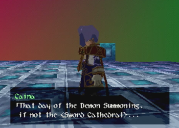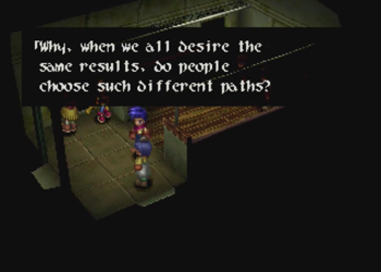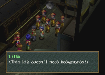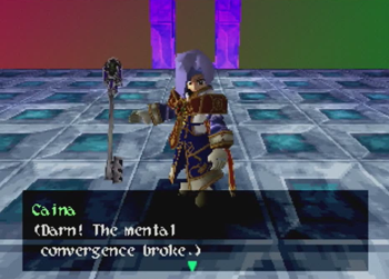 At first blush, this could easily be the ol’ “hetero washing” of any even potentially homosexual relationship in a piece of media as it skips across the Pacific (see also: an embarrassing amount of localized 90s anime). On the other hand, the localization of Wild Arms 2 is so… confused at times, that it’s entirely likely the translation team simply looked at the effeminate kid with a crush on a male superior and assumed “that’s a girl!” And it can’t help that Caina appears to be wearing a Sailor Moon-esque giant ribbon on his butt, either. I can see how someone would get confused (but, then again, on my first playthrough of Chrono Trigger, I thought Lucca was a boy).