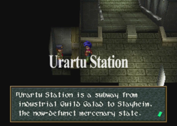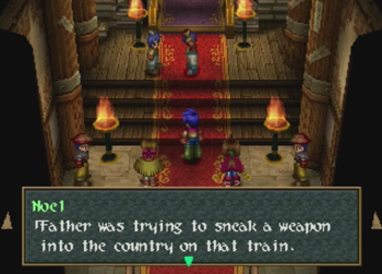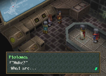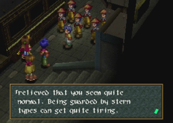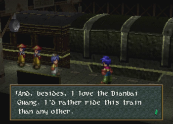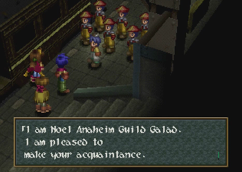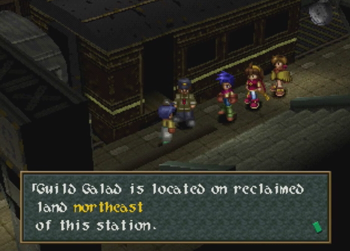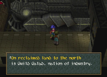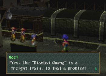 Okay, so if you didn’t notice the Raiden hats on Noel’s crew, Guild Galad is supposed to be not only the technological center of Filgaia, but also some kind of Fantasy Far East, and more China than Japan. Thus, some of the names around here get a little crazy. I can at least perform a cursory Google check on this one, so “Dianbai” is a place in China, and “Guang” is another place in China, and the name basically means “big”. Anybody with some Chinese knowledge want to help out here?