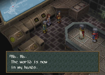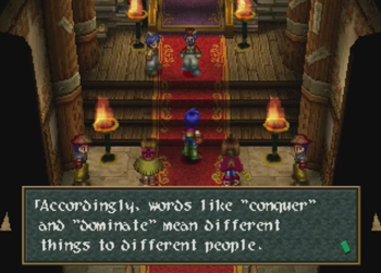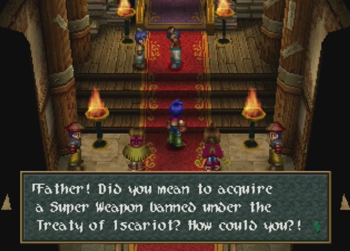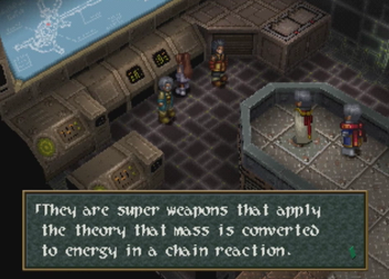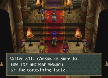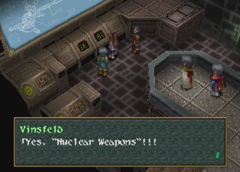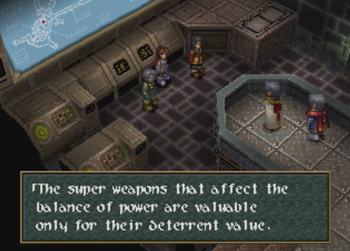 And Vinsfeld elaborates. A quick note here, but Wild Arms 2 is distinctly not using a fantasy “Angel Weapon” or whatever here, they are talking about straight up nuclear weapons, and their theoretical value as a deterrent against war (well, hot wars). This is surprisingly heady for a fantasy old west JRPG where one character just earned a tool that magically shoves blocks.