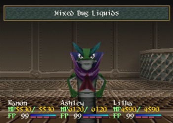 This is a weird fight, as Arms Killer seems to have a pile of attacks. If I were to guess, it seems like this creature is supposed to have attacks that particularly target characters and their weaknesses… but WA2 isn’t that kind of game. Every member of ARMS has the same weakness: getting hit by absolutely anything and losing HP. So all these varied elemental attacks don’t really do anything interesting. Maybe something happens if you’re wearing an elemental ring? I don’t know.