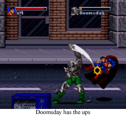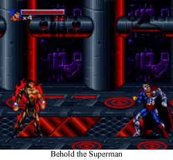 The Death and Return of Superman technically features five playable characters: Steel, Cyborg Superman, The Eradicator, Superboy, and Superman: Original Flavor. Officially, that is five different people (mostly people), but, for the purpose of this beat ‘em up, they all play exactly the same. They all have a projectile, they all have a screen-clearing “super move”, and they all have a flurry of generic combos and attacks. And, in a way, that is fairly on-point gameplay, as there is supposed to be confusion as to who is the real Superman. Superboy is a clone, The Eradicator has the power, Cyborg Superman could have the body, and Steel has the heart and drive of the Man of Steel. They’re all supposed to be worthwhile Superman replacements, and, since they all play the same, they could all qualify. So machoIt’s not lazy coding, it’s a feature! And speaking of potential laziness, every boss (aside from Doomsday) is either an anonymous “trap” (like an angry robot), or another one of the Supermans. Cyborg Superman vs. Superboy. Eradicator vs. Steel. Superman vs. Cyborg Superman. This could practically be a fighting game for much of the plot, and it would be one featuring only variations on one character.