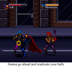 • Friendly Fire: One interesting shift in the beat ‘em up standard here is that the random mooks can accidently fire missiles and punches at each other. Some really deft and careful dodging could probably lead to a successful “pacifist run” of everything but the bosses.