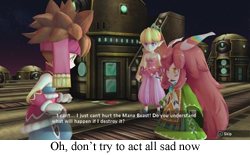 Sticky!Combine that heartbreaking plot with music that would be right at home with classical requiems, and you might get the impression that Secret of Mana is serious business. Or, at least, that was always my impression of the game. When I was playing SoM back in the early 90’s, my imagination went wild with thoughts on the “real” Secret of Mana, a game that could nary be contained by a simple 16-bit cartridge. The sunken Mana Palace? That was supposed to be a window into a destroyed city from “our” modern times, right? The faux subway car fall of zombies could have been indistinguishable from Resident Evil if the SNES had a little more horsepower. The gorgeous forests would still have been a tour de seasons, but it was only a lack of bits that held us back from witnessing Flammie’s mother’s ultimate fate in the jaws of a giant serpent. I was a pre-teen that played violent videogames, of course I imagined Secret of Mana as a gore fest. And, while my desire to see a submerged city full of corpses has lessened over the years, I still have always seen Secret of Mana as a serious game for serious people. I might have scored a midge mallet from a dwarf after fighting a whacky robot, but the somber opening and ending of Secret of Mana leaves an indelible impression that this was a story slightly deeper than your average plumber v. turtle morality play.