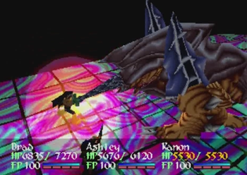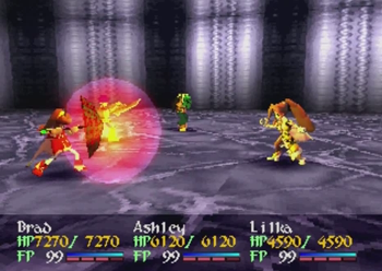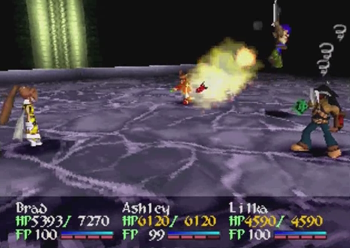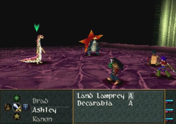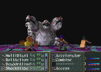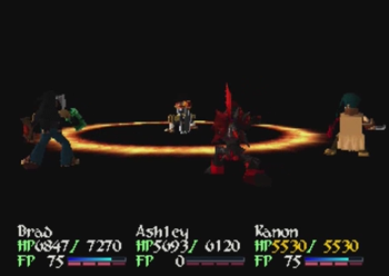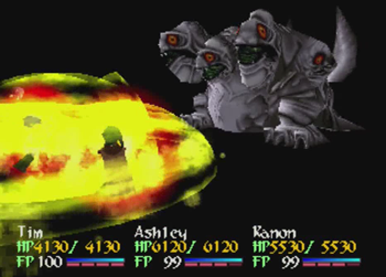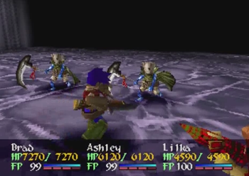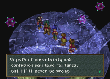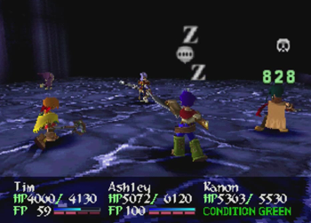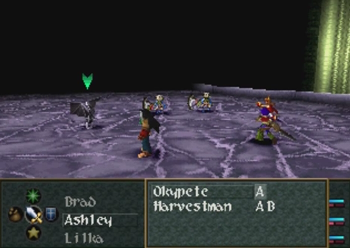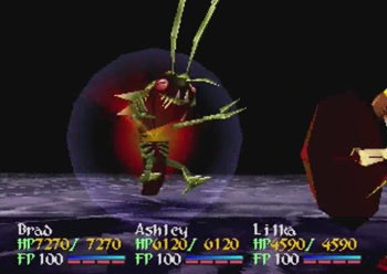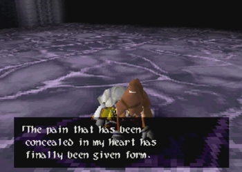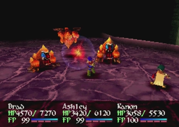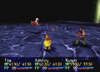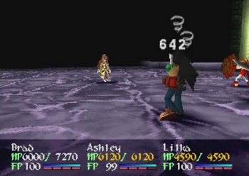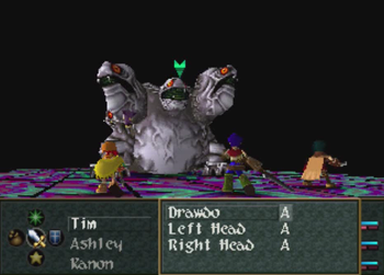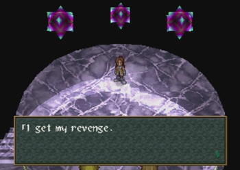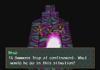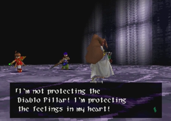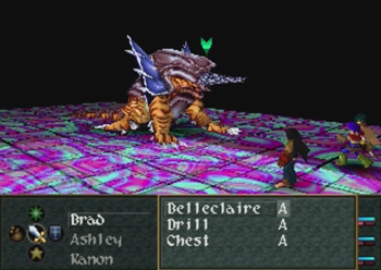 Due to reckless cheating, I haven’t talked about unique Wild Arms 2 status ailments much. WA2 has your typical poison, sleep, and confuse statuses, but here Brad is affected by… Ugh, what is that symbol supposed to mean? It’s either “forgetfulness”, which means the character won’t earn EXP, or “downhearted”, which means the character gains FP very slowly, effectively crippling the use of abilities. I really should know what that icon means! But it’s not in the manual, and I’m not even done with one Diablo Pillar yet. Let’s assume it’s downhearted.