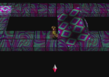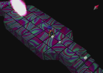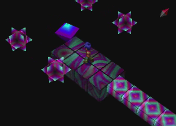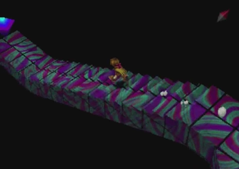 You’re chased by four blocks on a narrow, square platform. You have to outrace the blocks and blow ‘em all up before a bridge will appear.