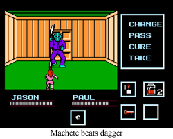 • An end: This game is artificially inflated by requiring three separate Jason kills. This is fairly appropriate, given the source material, but it’s also inordinately anticlimactic when you finally beat Jason, and the narration just says, “Yeah, he’s dead this time.” At least you win! (?)