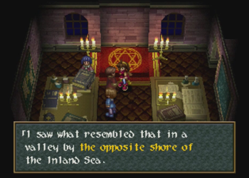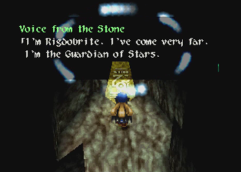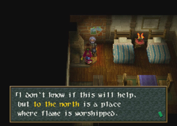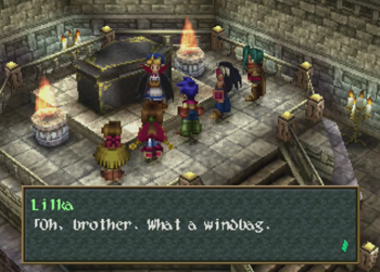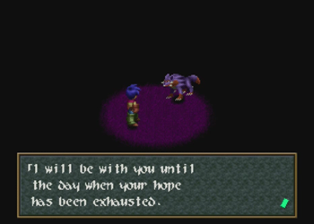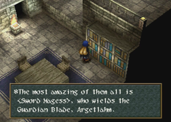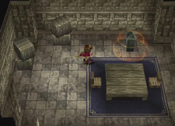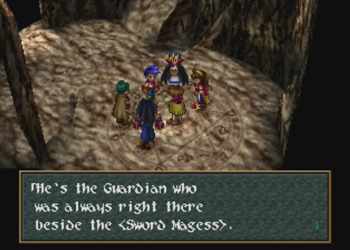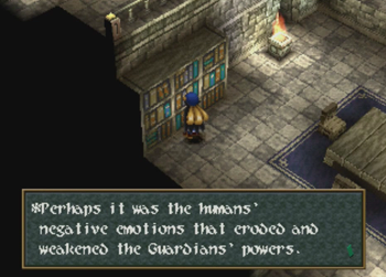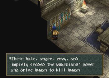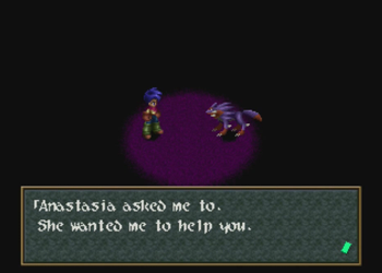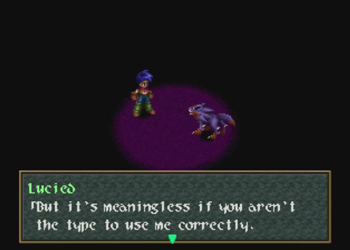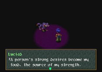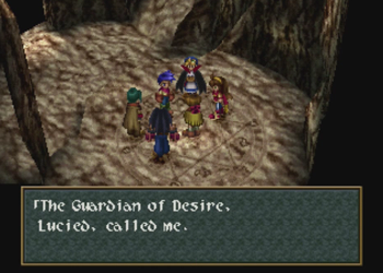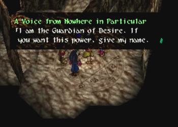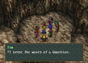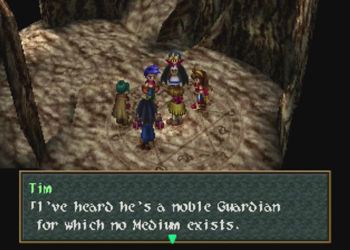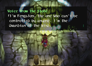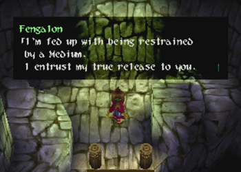 Fengalon is an angry cat-type Guardian that uses wind attacks. As expected, he confers a pair of wind spells to Tim. However, Fengalon’s unique skill, Pickpocket, is the only “steal” command in the game. As such, you really should pick up this Guardian earlier rather than later, so that way you can earn… useless crap. Hey, this isn’t Xenosaga and its damned steal-required special moves again. However, you do need pickpocket for at least one other sidequest we’ll be hitting soon enough, so it’s good to have.