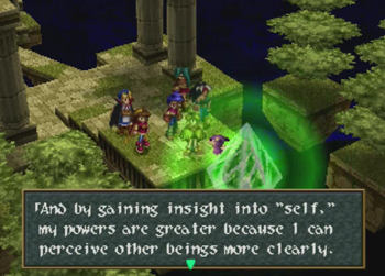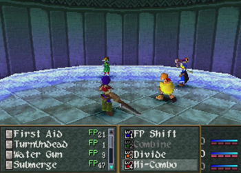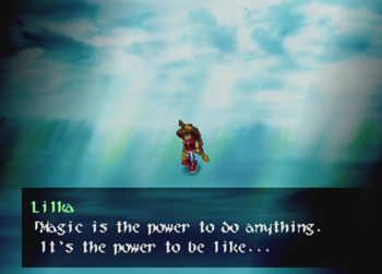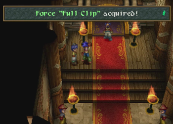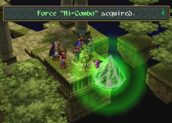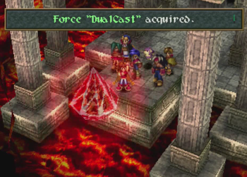Lilka earns her fourth and final force ability, DualCast. On one hand, it’s just X-Magic, and allows Lilka to cast two spells in one round. That’s lame. But! DualCast also has properties that are not very well documented within the game, and casting two “alike” spells together will sometimes create a new, much more potent spell. Okay, it’s actually pretty straightforward: all of the elemental spells, the two main cure/heal spells, and the one non-elemental damage spell (saber) are the only spells that combine, and they only combine with themselves. So, basically, Dualcast Lit1 and Lit2, and you get Lit3. Pretty neat!