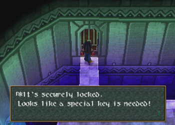 You might expect the typical JRPG answer here of we have to find a key somewhere in the dungeon… but the dungeon just started, and there are no treasure chests around. Maybe we have to find a key in some other corner of the world? Or hire a locksmith? … Treasure hunter?