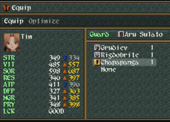 Chapapanga confers two skills to Tim: Lucky Word, which raises the party’s luck, and Goldhammer, which, like the summon itself, does who knows what. Apparently this “Lucky Shot” is supposed to increase item drops, but I haven’t seen it work when I wanted it to work. Lousy, rotten luck…