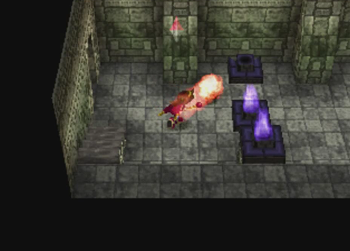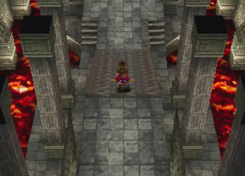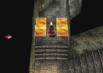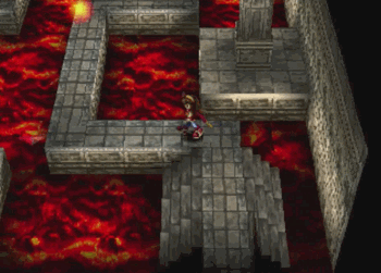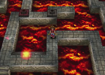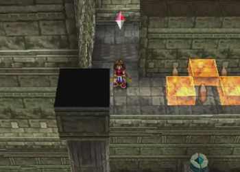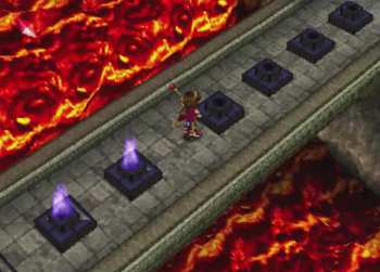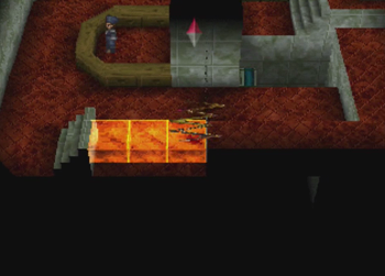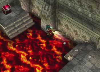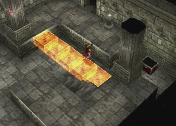 So, for reasons that should be obvious to anyone born of mortal flesh, you don’t want to fall into the lava. However, lava is only an HP drain issue, so it’s not too big of a deal if you decide to take an extremely hot bath. The other issue with these rooms is that you have to find proper locations to light the red torches, and avoid lighting the gray torches. It’s not that difficult, you just have to get a handle on the geometry of the area.
