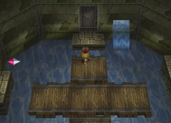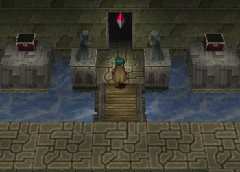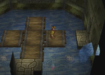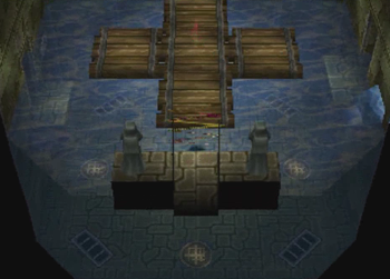 And now for the hub of our water dungeon: a room with a raised raft, and a number of doors and objects that are clearly underwater. Link would be proud. Or terrified.