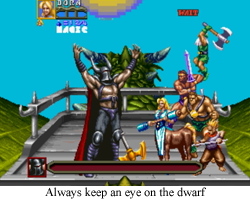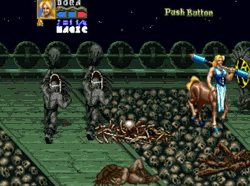 It’s a kind of magic: This is the only Golden Axe title where a magic spell can summon a helpful item, and not just universally attack the screen. Trix the Elf can summon a tree that grants life giving, magically delicious fruit for the party. This adds an interesting “magic equals life” wrinkle to the gameplay… but most of the time you just reflexively hit the magic button when you’re surrounded, and wind up with a lousy bush instead of a mighty dragon. Good effort, Trix.- Favorite Character: Did I mention there was a centaur? Dora has all the power of a woman and a horse. And she seems to have really useful magic, too. There is literally no competition among the men here.