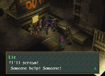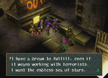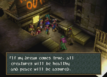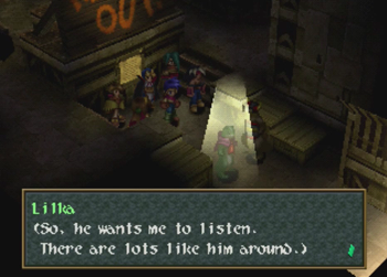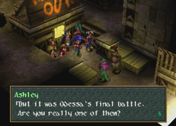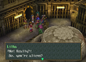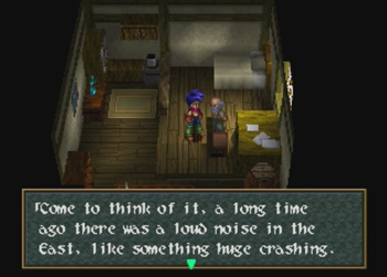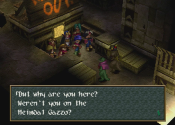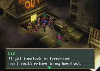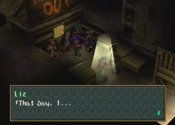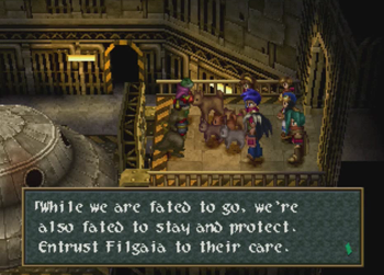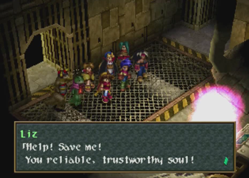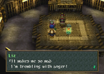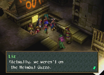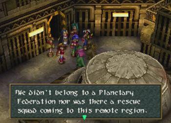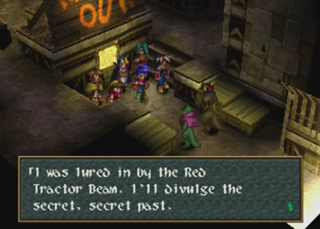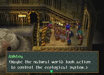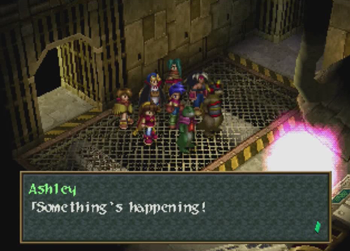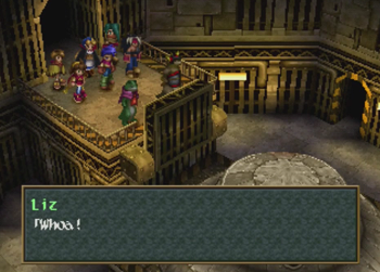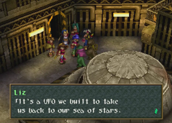 According to people attempting to make the whole translation of Wild Arms 2 make sense, as far as anyone can tell, the “red tractor beam” mentioned during the previous scene was the transmission that Vinsfeld broadcast over Filgaia, and that apparently sucked Liz & Ard down to Filgaia, where they “joined” Vinsfeld by general coincidence.