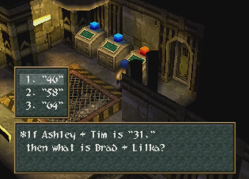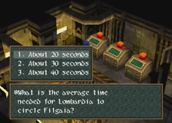 On the other hand, these questions absolutely shatter the fourth wall, and you might learn something new about the world of Filgaia by trying to discover the right answers. “46” is the right answer to this question, as Brad is apparently 32, and Lilka is 14. I think Lilka’s age is already noted in the game…