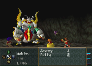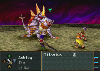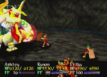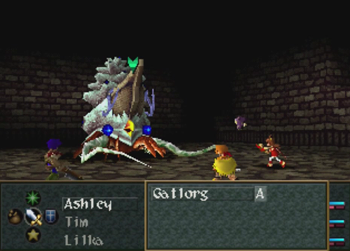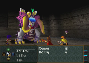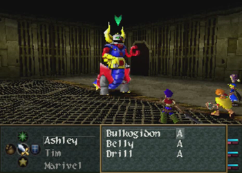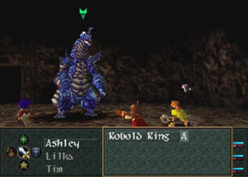 Kobold King is on about the same level as that boomerang butthead from earlier. It has a lot of physical attacks, one full-party, earth-themed attack, and one super-powerful attack that has a tendency to miss.
