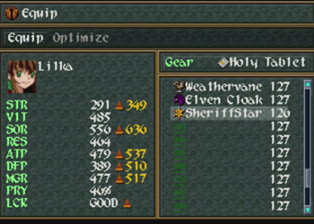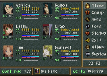 As this is the absolute end of the game, I decided to gameshark back in a maximum number of items (both consumables and accessories), and maxed everyone’s HP to 9,999. To be clear: these changes will even still not make these battles easy, but I’m not going to have to juggle rings or worry about conserving healing items. Note that it is possible to have HP (nearly) this high through exploiting the skill point system for HP at level ups as early as possible… but that requires a bit of foresight grinding.