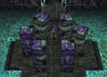 The idea is to get all of the pillars simultaneously facing their purple bits toward the final door. It’s not that difficult, and there are no random encounters in this area, so it’s just a matter of trial and error if you’re not great at playing with blocks.