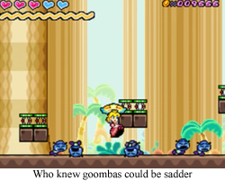 Super Princess Peach is largely a 2-D Mario title with two different kinds of movesets. On one hand, you have Peach’s innate (and sometimes umbrella-based) abilities that are available at all times. Of course Peach can perform her seemingly natural floating jump, attack with her parasol, and even perform a cool little slide that will certainly earn her a “safe!” at home plate. Then you have the “vibe” abilities, which seem to be what everyone remembers about this title. Princess Peach apparently has drastically different moods that can be controlled with the tap of a stylus, and her various outbursts come in handy for the more “puzzle” based portions of levels. A Sad Peach rains tears on the area like a cursed sprinkler, so plants grow happy, and cold floors turn to ice. Calm Peach sees her health restore automatically, while Delusional/Happy Peach can literally fly through the skies on her own private wind currents. And Angry Peach burns with the fury of a thousand raging suns, a walking, all-consuming blaze of disaster that shall envelop us all and leave this planet a charred husk (and maybe knock-out a few goombas). Give or take a final ability that allows for unlimited spending, Peach is limited by a rapidly depleting gauge for all of her emotional abilities (so you can’t just fly through every level like a
