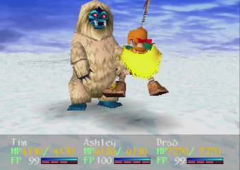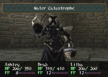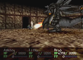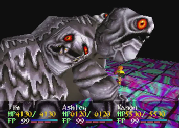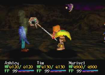 While I’m thinking about it, let’s talk about Ashley Winchester. Ashley, as the main protagonist of the title, is basically the living embodiment of the narrative’s central themes. He’s a well-meaning “average joe” that is thrown into an unusual situation and is arbitrarily forced to be a hero… but pulls back so he can lead a happy life with his girlfriend and eventual family. Or, at least, that’s what the plot tells us happens. This is a JRPG, so Ashley is supposed to be an average dude in unusual circumstances who incidentally routinely kills gods. Wild Arms 2 has a major disconnect between Ashley the thesis on a hero that relies on the power of friendship and Ashley the guy who transforms into an unstoppable monster man at 100 FP and squashes the King of All Monsters (title pending review) beneath his heel while the rest of the party is dead. This whole story about how heroes aren’t necessary is fun and all, but given the swath of dead monsters littered across Filgaia, and a healthy 75% of them were killed by one guy, that central theme doesn’t exactly ring true. Yes, Ashley managed to come out of his heroism better than Anastasia (dead @ 16) or Brad (a lengthy prison term followed by… did anyone ever remember to remove his bomb collar?), but the guy still definitely qualified for “chosen one” status when he was swinging that “chosen sword” around. Yes, he lifted that sword with the power of his friends, but I didn’t see them helping out during the final-final battle.