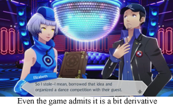 Persona 3 features demons, monsters, and a particularly homicidal version of Jungian psychology. It is also Day Planner: The Game. Persona 3 has frequently been referred to as “Japanese high school simulator”, but, even more than that, it is a game about balancing your (avatar’s) life. Do you go out tonight (and fight monsters), or do you stay home and study for that test tomorrow? Are you going to spend the afternoon hanging out with your girlfriend, or your best friend? The nerds dance, tooAnd would you like to spend time with the kindly old couple that is obsessed with a tree (?), or is it time to while away the afternoon playing a MMORPG where your homeroom teacher is inexplicably hitting on you? Decisions, decisions! Persona 3 isn’t only about choosing your battle tactics, it’s also about choosing your friends, afternoon plans, and how you combine trading cards into demons that may or may not summon the apocalypse.