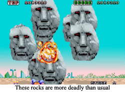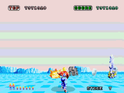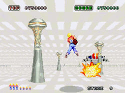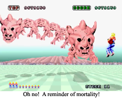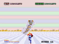Rock 'n RollThere are eighteen levels in Space Harrier. There are a couple of bonus stages in there, but, aside from that occasional Flammy ride, every thing in every stage is trying to kill you every second. Bosses are bullet sponges, mundane mooks are menacing many minutes, and even inanimate objects are instantaneously fatal at the slimmest contact (though, granted, ol’ Spacey is moving pretty fast). There are no distinct power ups in Space Harrier, so the best you can hope for is temporary invincibility after a lethal collision. A new life grants you a few seconds of sanctuary, but after that grace period is terminated, you could die in every Space Harrier stage literally every five seconds. And suffice to say, if that’s your playstyle, you’re going to need a lot of quarters to see the boss parade finale.