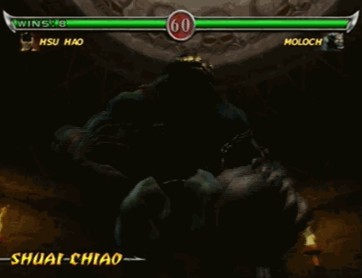 Moloch is the “monster” sub-boss of MK: Deadly Alliance. Like Goro, Kintaro, and Motaro before him, he is meant to be a brick wall before facing the real final boss(es) of the title. Moloch was born an oni (I have no idea how that works) and he has a gigantic stature, three eyes, blue skin, and a wrecking ball that he holds in the palm of his claw. As of this writing, he is the last “giant monster” sub boss that was introduced in the franchise, as future games either used gimmicky humans (like a team of Noob & Smoke), reused previous big bosses (say hello to Goro again forever), or saved their big guy for the real finale (behold the glory of Blaze).