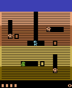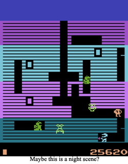 And it’s easy to see why: everything is here. There may be only two monsters in Dig Dug, but they both showed up. They both function in the exact same way, and they both pop in the same satisfying manner. Rocks are there. The tunnels are familiar. And all the secrets of Hanzo’s favorite offense are preserved. This is Dig Dug. It might not have the finer graphics of the arcade edition, but, for a game that had to survive on the Atari, it is very much Dig Dug. Even a primitive attempt at the dirt gradient is here, complete with the different colors that appear on later levels. That means they actually expected someone to get past the third stage! That’s dedication and optimism!