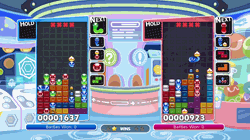 But just because both games are involved, don’t think they don’t completely interact. Back in the Super Nintendo days, we had Tetris & Dr. Mario, but that title was little more than an excuse to tape two Gameboy games together and sell the package for $70. Tetris and Dr. Mario intermingled about as much as Super Mario Bros. 2 and 3 in Super Mario All-Stars. Puyo Puyo Tetris is another story. You can play head-to-head Puyo Puyo or head-to-head Tetris, but you can also play Puyo Puyo while your opponent picks up a game of Tetris. And it’s not simply “parallel play”, a properly completed Tetris can send junk sailing over to your Puyopponent. And it doesn’t stop there! There are other “versus” modes available that involve both games, like a puzzle speed run mode (called Big Bang Mode because “puzzle mode” sounds like a punishment), or another option where the game rapidly alternates between Puyo Puyo and Tetris boards. There’s even a mode that combines Tetris and Puyo Puyo into one focused game that adopts blocks and puyos from both franchises.