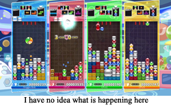 How about that Story Mode: Is this what it’s like for other people playing Kingdom Hearts? There are just all these weird anime characters with silly hair running around and shouting at each other for level after level, and, eventually, it is revealed this is all because “god” is angry and lonely and might need a hug. Or to play Tetris. And then the universe is saved thanks to a robot that sounds like a Pokémon.- Did you know? This is the first American release of a straight Puyo Puyo title since Puyo Pop Fever in 2004. Everybody counts the years between Metroid releases as some sign as to whether or not the franchise is dead, but nobody gives a damn about when Puyos haven’t been seen for a decade….