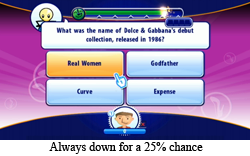 Fun for all ages: The questions do change according to the average age of the players. Or at least there are a lot more questions about Shrek if you claim to be 12. Of course, the whole thing is based on your registered birth year relative to the release date of the game (2007), so if you’re currently 25, the game will assume you’re a twelve year old.- Favorite category: It’s Fashion. I’m not good at the Fashion category, but it feels great when I get any question right in that category, because, come on, I barely understand how pants work. I’m punching way above my weight class anytime I score a point in the Fashion category.