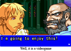 And speaking of testimony, Final Fight One, the Final Fight version that appeared on Gameboy Advance, allowed “new” Cody and Guy to be playable characters. After punching enough dudes, you can select not only Guy, Cody, and Haggar, but also Street Fighter Alpha’s Guy, and Street Fighter Alpha 3’s Cody. This means you can play as Cody in his 2nd evolution: a down on his luck convict wearing his prison stripes. Given the dialogue spoken during Final Fight One (and, yes, this is the one [non-mighty] Final Fight version where the characters actually talk past the opening), the “future” characters are revisiting their own memories of Final Fight as their older selves. So why would that be happening? The answer lies with “Prison Cody”: this is one of Cody’s many parole hearings, and Cody and Guy are both testifying about how Cody is an upstanding citizen (that punches hundreds of other citizens). Future Cody even admits that he does not remember the factory area (because he took a shortcut), but goes with the story because he wants to show accurate parity with Guy. Everybody on the same page? Great! Maybe Cody will be back on the streets and… fighting? Again? No, probably best to keep this malcontent locked up.