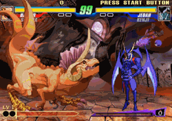 While Red Earth was a potential new future for fighting games, Capcom Fighting Evolution forsook its name and sounded a death knell for the genre. Capcom Fighting Evolution was less a brand new experience and more of a “going out of business sale” for an era. Capcom took four fighters from each of its most popular fighting games, and plunked them all in a 2v2 fighting game. And, while that could have been fun for everybody, a significant drawback of this process was reusing the original sprites of each of these brawlers without any attempt to visually normalize… anything. Morrigan’s sprite was the creaky bane of MvC2 in 2000, and Dimitri did not look any better next to Street Fighter 3 characters four years later. And, to make matters worse, those sprites from Street Fighter 3 that looked so gorgeous in their original game had a number of frames and animations reduced, so they were literally pale imitations of their former selves. And, lest you think these complaints are entirely graphics-based, don’t worry, a game that attempts to merge the intricacies of three different Street Fighter games, Darkstalkers, and an asymmetrical “boss fighter” doesn’t exactly work from a gameplay perspective either. You wouldn’t parry a dinosaur!