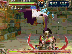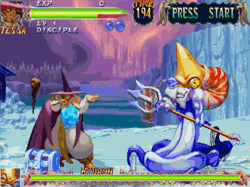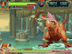 Squidly bitsAnd while we are looking at reasons Red Earth was able to set itself apart from the pack (no lions at all involved in that statement, to be clear), consider that this was the first of three(ish) games to feature Capcom’s CP System III. In layman’s terms, pondexter? It means that, like its CPS3 brother, Street Fighter 3, this is one of the most gorgeous sprite-based fighting games out there. Everything from the cloth on Tessa’s hammer pants to the heat bellowing out of Hauzer’s maw is elegantly animated. Even “incidental” bits, like the continue screen countdown, include pixels not likely to ever be seen again. CPS3 may be known for Street Fighter 3 (and maybe a JoJo game), but its maiden voyage here really makes an impact on the ol’ eyeballs.