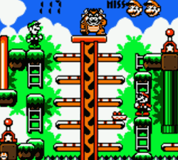 A Mario Bros. where two brothers prove their plumbing credentials through flipping over turtles and crabs is the Mario Bros. everyone always remembers, but Game & Watch Mario Bros. was released four months before its arcade brother. It was a horizontal dual screen Game & Watch title, and saw Mario and Luigi (again, appearing in a game for the first time) working at some manner of delivery plant (is that a thing?). Both of the brothers (each clearly labeled by their respective joypads as “Mario” and “Luigi”) must work in tandem to pass something (boxes? cakes? bottles?) along and into a waiting delivery truck. There are not any “tricks or traps” to speak of, but the intermediary conveyer belt is a harsh mistress, and likely to break more than a few whatsits if the brothers (or your thumbs) don’t move fast enough. There are no monsters here, though, so this is a wholly mundane adventure focusing on what must be Mario & Luigi’s summer jobs. And speaking of jobs, this particular Game & Watch model eventually earned sponsorships from some businesses like Pokka (a Japanese food company) and Campari (an Italian liqueur producer). So Mario does know what alcohol is!