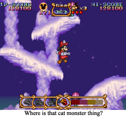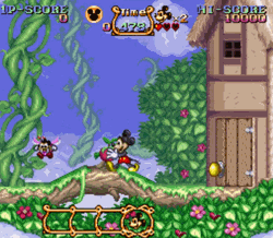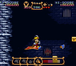 Speaking of Mario, The Magical Quest Starring Mickey Mouse is undoubtedly one of the easiest titles in the Ghosts ‘n Goblins franchise. It is funny how a few minor changes make a difference in difficulty level. Mickey has three hearts to Arthur’s two, and additional “golden armor” hearts only make our hero even more resistant. Furthermore, there is a “shop” feature that can provide extra lives and powerups, so all those “money bags” that Arthur was always hording serve a purpose here. This would eventually be utilized in Ghosts ‘n Goblins Resurrection with the collectible sprites that offer new abilities, but here it just offers Mickey a rudimentary leg up on his opponents. But these enhancements don’t mean it’s all fun and games for Mickey. The main offensive options for the costumes all require “energy”, and, while refills are abundant (and outright repeatedly provided during boss fights where they are a requirement), Arthur never had to worry about rationing his torch output in the middle of a heated battle. And that grappling hook powerup? Let’s just say that Arthur, double jump or no, would not survive the platforming challenges Mickey would be forced to negotiate. It doesn’t matter if you’ve got a pile of hitpoints when those hearts take a dive into a pit…