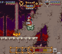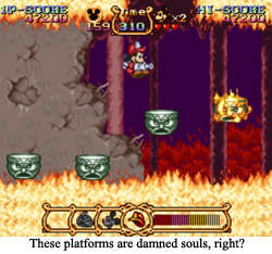 Well, yes, the Fire Grotto, is where the ghouls really kick into gear. The whole stage starts with a downward elevator ride that recalls a similarly deadly situation in Ghouls ‘n Ghosts (though at least that elevator had the decency to go up). Then Mickey does the typical Demon Realm entrance thing by traipsing through a fiery Hell. Practically everything is on fire in this stage, and, while the firefighter costume does mitigate the various heated issues, you still have to deal with platforms that are apparently fueled by cranky souls. And a flaming stone guardian to top it all off? Be afraid, Mickey, be very afraid.