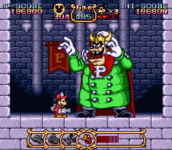 And then the finale of any good GnG game: the haunted castle. As alluded to in earlier levels, the final boss of this title is Pete, a giant, monarch-style creature in the vein of Astaroth, Lucifer, or Sardius. Does he have an extra face under that regal cloak? Who knows! But what we do know is that Pete’s Castle is the proper finale for this franchise, as it is a challenging, imposing area filled with monsters of all shapes and sizes. And spikes! The ol’ Capcom staple of just covering every goddamned thing with spikes and then throwing in a light boss rush is all that stands between Mickey and rescuing his princess. (… Who is a dog. And, to be clear, that is not a judgment of a princess replacement, Pluto is apparently literally a dog. At least this time the ending won’t reveal the “damsel”’s measurements.)
