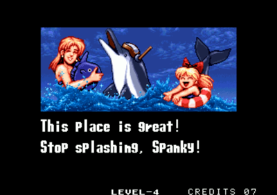 But wait! There’s more! Spanky has multiple endings! Every duo in Aero Fighters 2 has an ending that is specific to the two characters in question. And this is not a simple “fit the same pieces together with slight variations” deal like Cannon Spike, either. If Spanky and Bobby win the day, you learn that Spanky can “always count on whales”. Hi-En learns to surf on Spanky, and Spanky obliterates Steve when the rockstar suggests that the dolphin join a circus. Spanky, Cindy & Ellen all get to party on a private island, and Robo Keaton only reveals that he is a Transformer when Spanky is present. And when Mao-Mao conscripts Spanky into a variety show (or… something?), Spanky groans that he can do better than being a featured oddity. Oh, and everybody dies in Silver’s ending. There… may be a parrot involved. It is weird. Let’s not dwell on it.