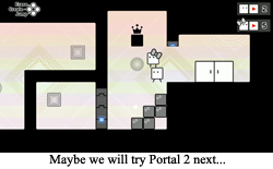 Husband and wife are both great at problem solving. This comes from years of curiosity, education, and a healthy diet of complicated cheeses with equally complicated packaging. But we both have very different histories when it comes to controlling little metal boys that must banish robotic masters. Man has decades of experience with every videogame system that has ever come down the pike (give or take CD-i), and Woman is uncomfortable so much as holding a controller. So things that I take for granted are wholly alien to my love. She does not “just know” the arc of a Boxgirl’s jump is always going to be the same. She does not realize that there are pixels of space that you can use to “float” a Boxboy over the edge of a cliff. And she better not have known that her moving Boxgirl at that one specific time was going to shove Boxboy into an oncoming laser, because if she does, she is a murderer. In short, she does not know platforming like her husband, and, even if she has the exact same (or better!) mental aptitude as her partner, she does not have the experience that tells her what is going to happen when she presses A. She has a general idea that Boxgirl is going to jump, but the how and where are a mystery.
