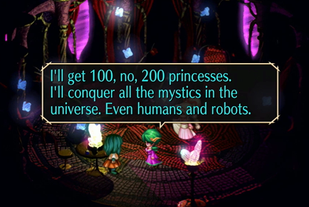 Let’s take a step back to look at Asellus’s whole story. Asellus is a normal girl who is crushed by horse-drawn carriage. The owner of said carriage, the Mystic Orlouge, seems to feel bad about this, so he somehow transfers his own magical blue blood to Asellus. Asellus then sleeps for over a decade, and awakens as a new, first-in-the-world, purple blooded “Half Mystic”. Unfortunately, Orlouge is not as generous as his blood transfusion would imply, and it turns out that Orlouge is a powerful Mystic that has enslaved at least 60 “princesses” (and three princes, for some reason). Orlouge, aka the Charm Lord, does not allow any of his “property” to leave his chateau without permission, so Asellus has now become an unwilling captive. Because pacing around a magical castle for hours would be a pretty boring videogame (though it did work for Mario), Asellus escapes, and is pursued by Orlouge’s forces. Later, after a particularly upsetting loss, Asellus decides to go on the offensive, and storms Orlouge’s castle to free herself and all the captured princesses once and for all. And, while the finale and Asellus’s reasons change to match the ending that is ultimately “chosen” at that point, all roads inevitably lead to Asellus fighting and killing her Mystic-daddy.