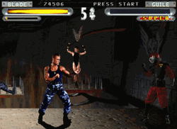 Hayato hails from Capcom’s 3-D weapons-fighter, the oxymoronically titled Star Gladiator: Episode 1: The Final Crusade. Thanks to Marvel vs. Capcom 2, Hayato is the only Star Gladiator character to get some traction outside of his parent franchise, and a significant reason for that may be that if any other company notices Star Gladiator, Capcom is going to get sued. For one thing, this game plays remarkably similar to Namco’s Soul Edge, released a scant year earlier. And once you get past the basic gameplay, yes, that is a man with what is absolutely a lightsaber battling what is very obviously a Wookie. That “energy sword” is even powered by a mysterious force that comes from the mind, and its ultimate wielder is a black-clad cyborg that kind of looks like a futuristic samurai. He even comes back as a “plasma” ghost!