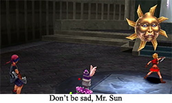 Don't look at meEvery JRPG needs a little unrelated fluffery to offer a differing perspective from the obvious protagonist. Final Fantasy 4 would not be the same without toddler twins from a magical city, and Chrono Cross would not be the same without including its own share of interesting support characters. Steena is your typical priestess that knows everything about the surrounding area. Guile is the enigmatic magician who appears to have his own agenda. Orlha and Van both have potential plot hooks with seeing their interdimensional “siblings” thanks to the quirks of dimensional travel. And we have a few JRPG stock characters here: the spiritual bruiser (luchador, in this case), the precocious kid that admires a lead (and uses a boomerang for some reason), the dancer that is trying to achieve more (a Fire Emblem staple), and the “wannabe hero” that will eventually grow into being a useful party member. None of these characters are “essential”, but they are the spice that flavors the JRPG.